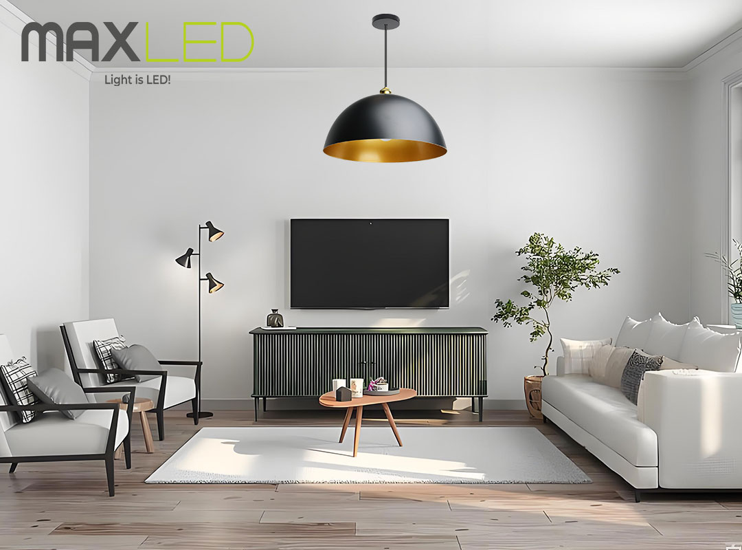 Die Maxled, Light is Led! Pendelleuchte besticht durch ein klassisches und elegantes Design, das retro-Charme mit moderner Ästhetik verbindet. Die äußere Schicht des Lampenschirms ist mattschwarz, während die Innenseite in Goldfarbe gehalten ist – dieser Kontrast sorgt dafür, dass das emittierte Licht perfekt reflektiert wird, einen warmen Glanz erzeugt und den modischen Charme des Raumes erheblich steigert. Der hängende Lampenschirm schützt nicht nur Ihre Glühbirne gut vor Stößen, sondern ist zudem ein echter Hingucker in jeder Einrichtung. Besonders in Kombination mit einer Edison-Stil Glühbirne (nicht enthalten) erweckt die Lampe die Atmosphäre des frühen 20. Jahrhunderts und verleiht jedem Raum Authentizität und Charakter.